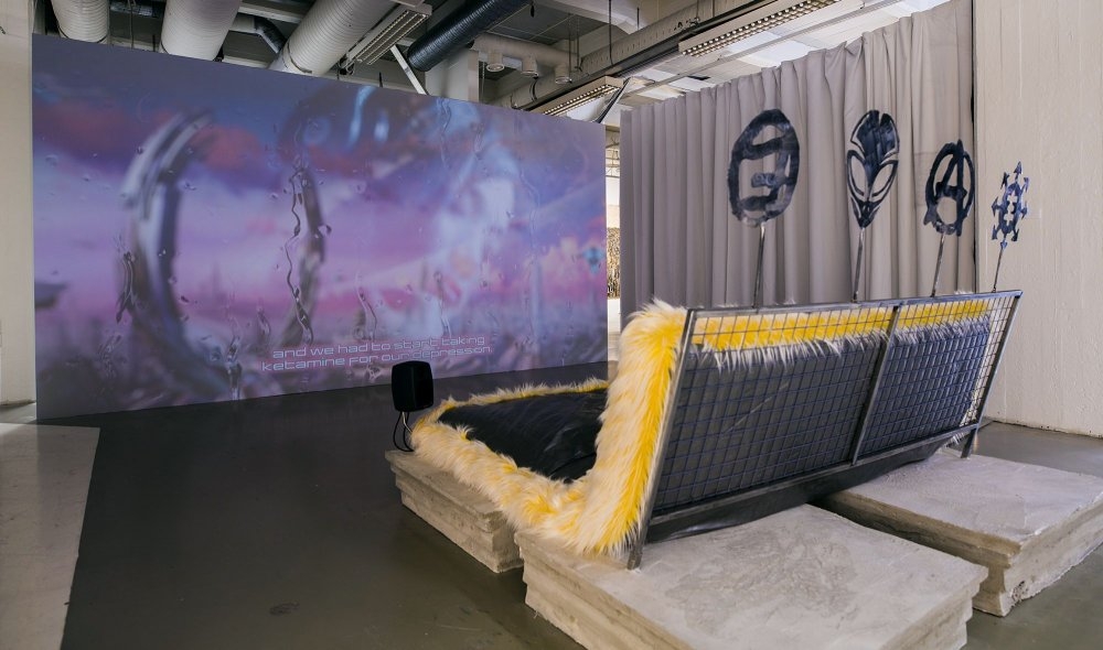 The audiovisual piece Just Life by Otto Byström references possible dystopian scenarios for the near future. His unsettling account of the impact of the accelerating rate of technological progress on society as well as on the individual is presented through the voiceover of a robotic female voice, with the narration composed and recycled from a multitude of sources – books and articles as well as personal conversations. The syrupy pink background featuring an animation of drops running down a glass pane, through which we can see a girl with headphones in a sci-fi landscape, evokes almost hypnotic sensations, heightened by the childish piano accompaniment, which sometimes verges into electro music. The speed of these developments and their constant sense of change result in people languishing in a state of hibernation, resignation and depression.
