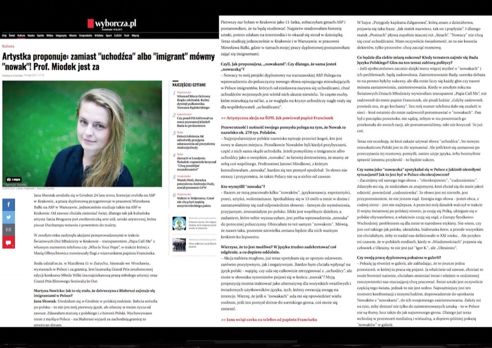 Yana Shostak se rozhodla podívat na uprchlickou krizi skrze polský jazyk. Vědoma si toho, jak signifikantní je naše vlastní řeč a jak formuje naše jednání, rozhodla se najít pro uprchlíky nový, méně svazující a svobodnější pojem. Výsledkem diskusí se samotnými uprchlíky a aktivisty, stejně jako s nejznámějším polským jazykovědcem v rámci jeho televizního pořadu, bylo překvapivé řešení: zapomenuté slovo „nowak“, které je přitom stále nejčastějším polským příjmením, označující původně napříč dějinami nově příchozí obyvatele. Shostak tak s humorem relativizuje novost a děsivost migračního problému a snaží se jej chápat mimo jiné jako sociálně jazykový konstrukt. / / / Yana Shostak has been selected in cooperation with Zbrojownia Sztuki and ASP Gdańsk.